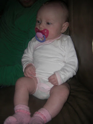 Man how the time has flown by! Tonight we were sitting on the bed and she was sitting propped up on my lets and she lifted her head up and looked all around. but it was more than just her head she is lifting her shoulders with it! i am so amazed at how much she is doing. she is gaining control of her motions!!! everyone is so amazed at her and the fact that she is only two months and is already doing all of these things.