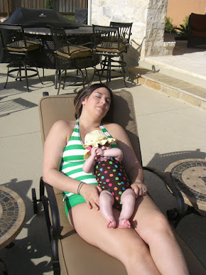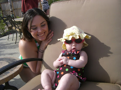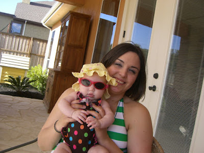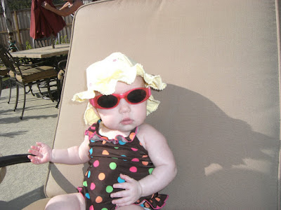 Today we went out to the pool for the first time with Ava. It was beautiful! 95 degrees here and really sunny! my parents don't have a lot of shade in the back yard so we put a lot of baby sunscreen on Ava. it smelled like candy! Huggies sunscreen is the one we use!!! we put her sun hat on and one of her bathing suites and sunglasses and headed out to the pool! we took a lot of pictures! here are some of them!