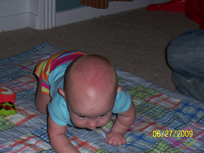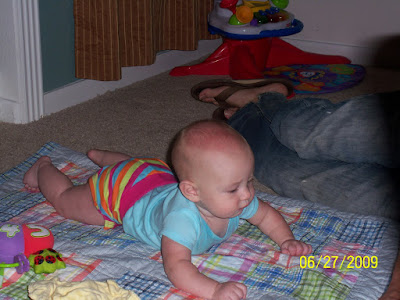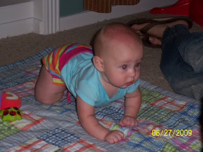 She is really progressing in the crawling area! she is moving her legs and not quite the arms! but she is almost there. we put something out of her reach and she gets up on her hands and knees and she moves or scoots closer to it then falls to her tummy and tries to reach it. if she can't she gets back up and does it again until she can reach out a grab it! she is so cute! she is doing so good! i will give her a week or a week and a half till she totally figures it out!