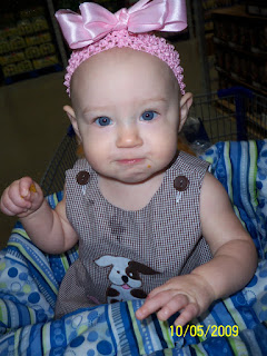 Today Ava and i went to Sam's because we were hosting a National Night Out at our Apt community. We had a great time. Ava and i go to Sam's about once a week at least if not more. It is our time together. even though we get all day together it is our outing of the week usually! We have a blast and everyone loves her. She loves the samples. She only gets the bread one. she gets the pumpkin bread everytime we go. She says MMMMM when she gets it in her hand. it is so cute.