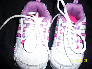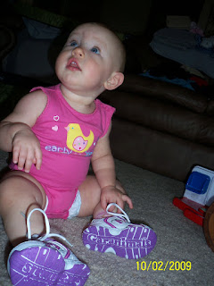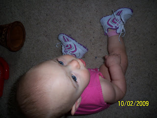 The other day i was at walmart and i was looking at the baby stuff and they had some cute shoes and i thought because ava is walking (only inside) and i wanted her to get use to wearing tennis shoes so when she is walking out side she will have an easier time. right now she only wears them for a little bit at a time.
